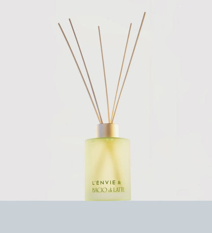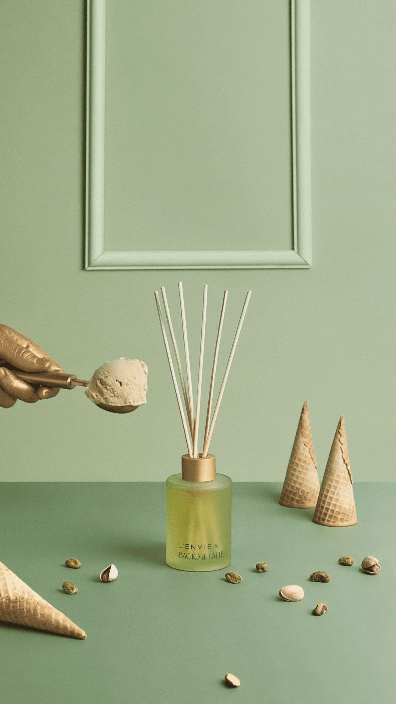 El difusor de perfume Pistacho de 130ml es ideal para perfumar cualquier ambiente de manera continua. Este cálido aroma es de la línea Baccio di Latte y evoca la sensación de una tarde soleada en Italia, con una cucharada de uno de los helados más icónicos.