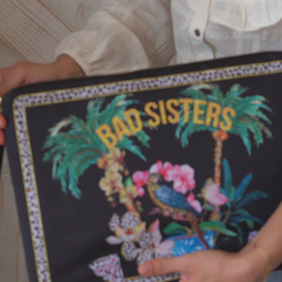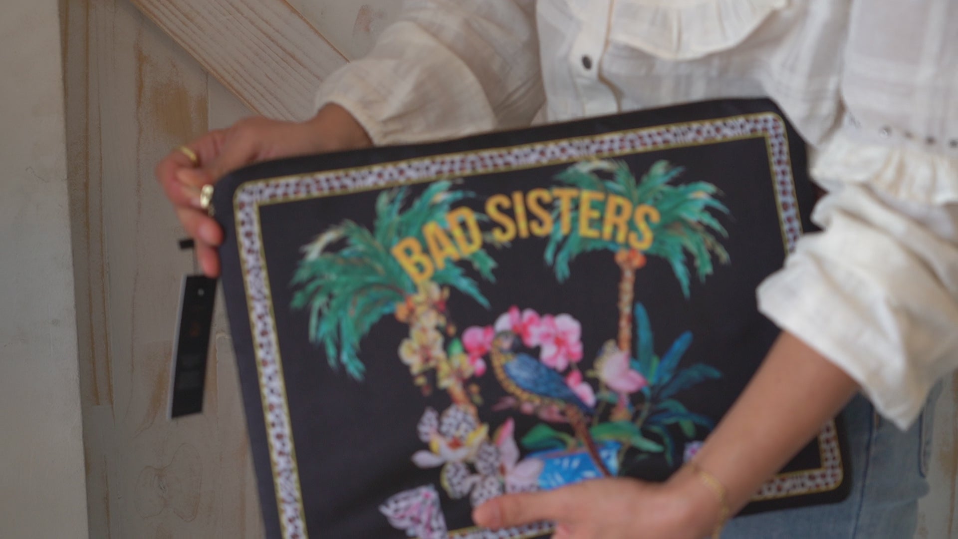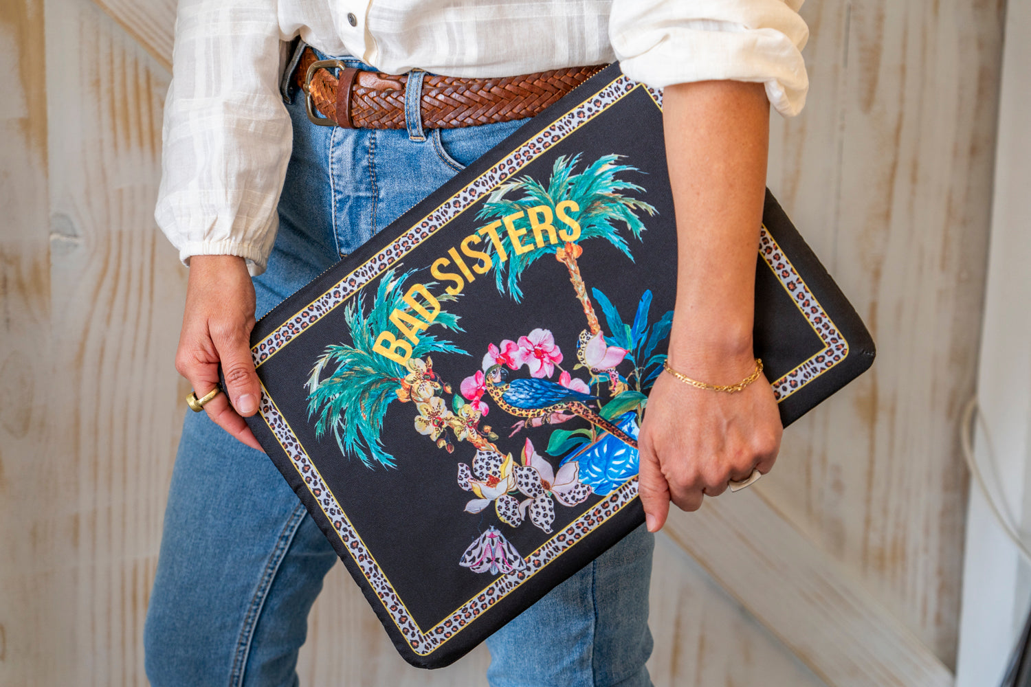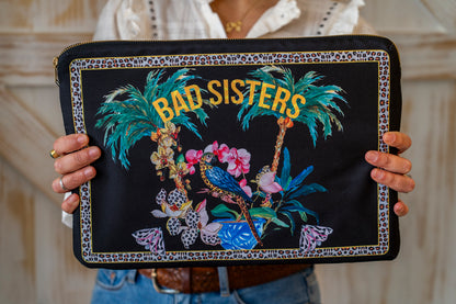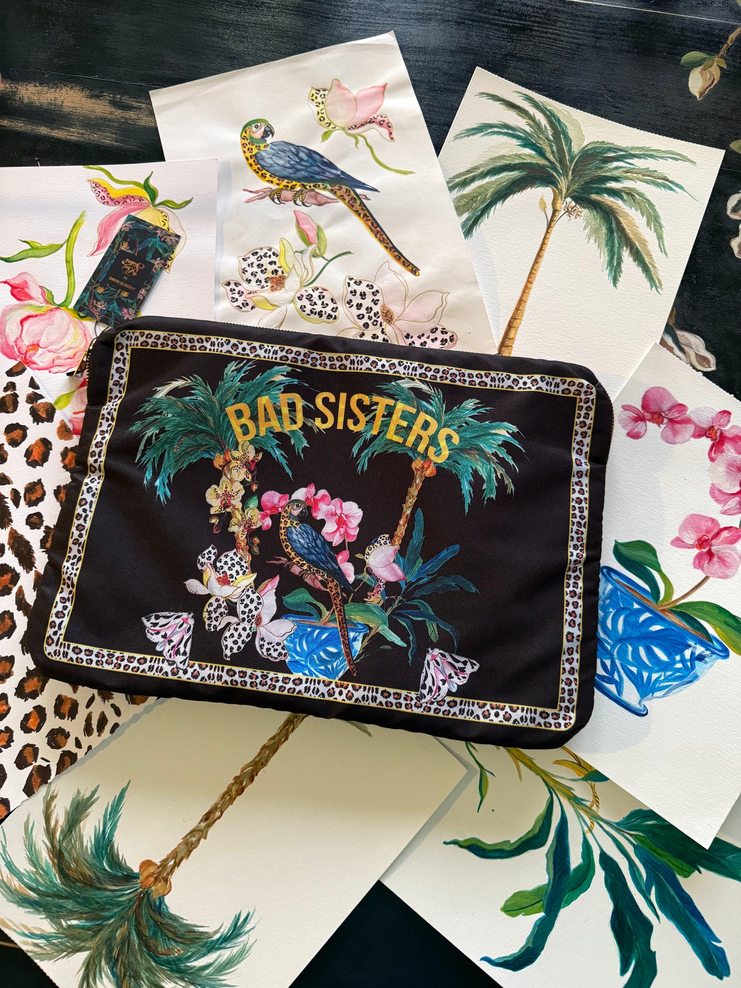 Esta funda de computador forma parte de una colección de edición limitada junto a Bad Sisters, con un diseño vibrante inspirado en la flora y fauna tropical.