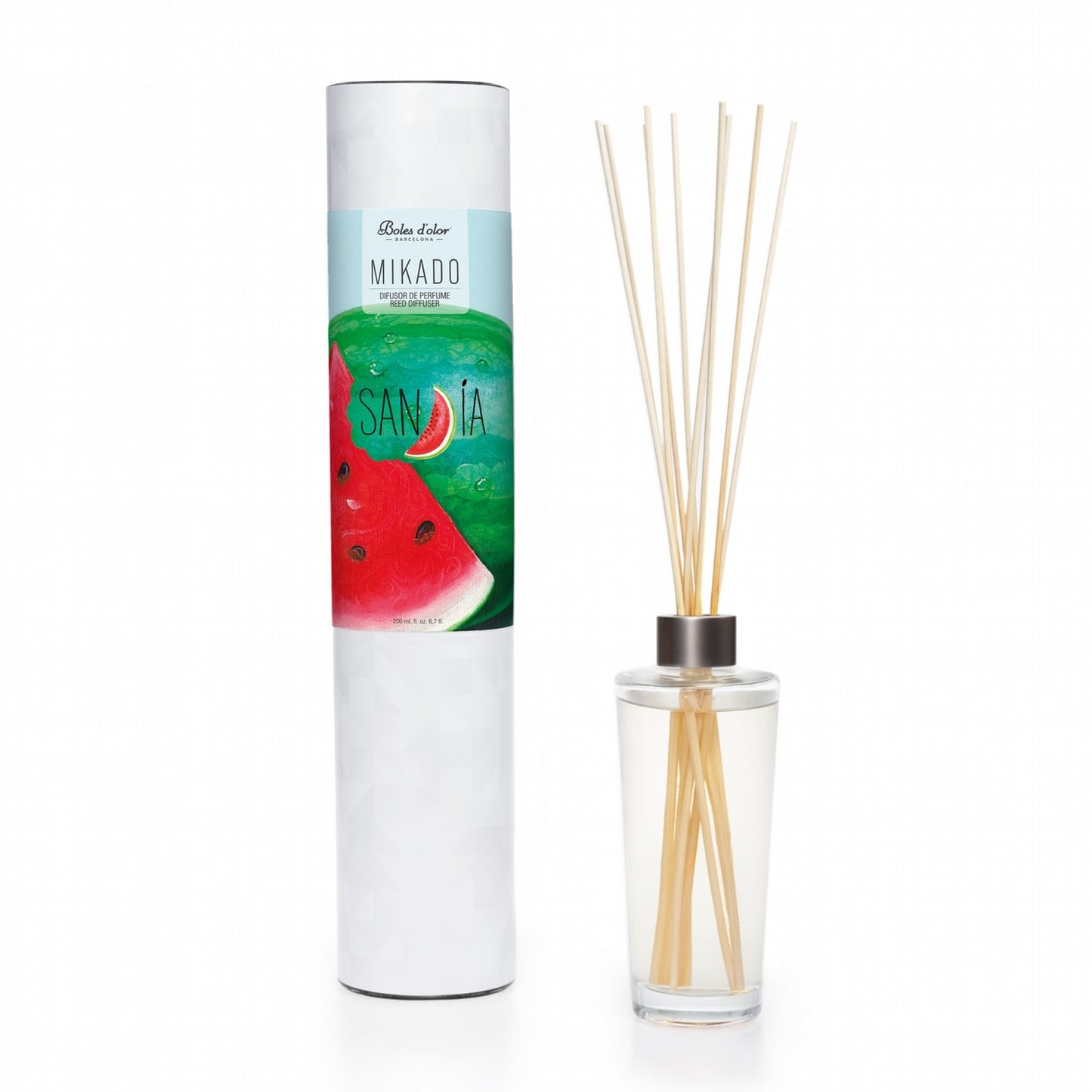 Difusor de perfume natural con varillas de ratán que absorben y difunden el aroma de forma progresiva, delicada y muy duradera. Aroma intenso y veraniego, jugoso y Dulce. Creado en base a Sandía, Naranjas y Tangerinas, con un toque de Melón Verde, Damasco, dulce Mango y Durazno. Dura hasta 3 meses. Recarga disponible.