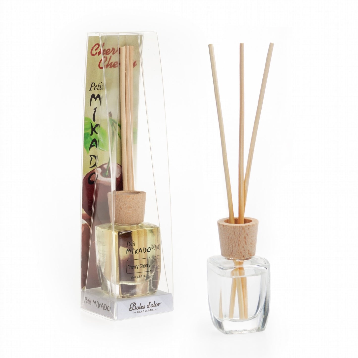 Mini difusor de perfume de alta concentración de esencia, con 3 varillas de ratán. Aroma Dulce a Cerezas Negras, simplemente delicioso. Compuesto por Cerezas Negras, Almendras y un toque de Canela. Diseñado para espacios pequeños como un baño. Dura hasta 6 semanas.