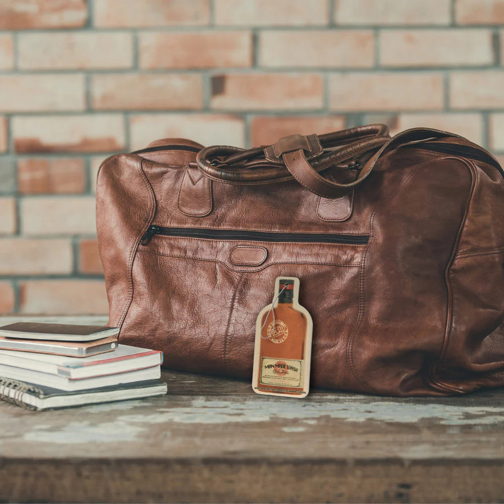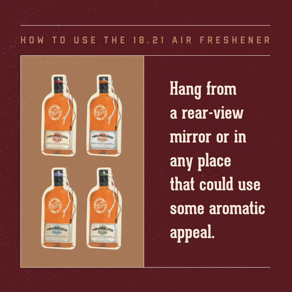 Ambientador colgante para auto, armario o cualquier espacio, inspirado en la icónica botella del Man Made Wash. Difunde el aroma Spiced Vanilla, cálido y elegante, con notas de tabaco, vainilla, madera ahumada, jengibre y coco, complementando los productos de cuidado masculino de la marca.