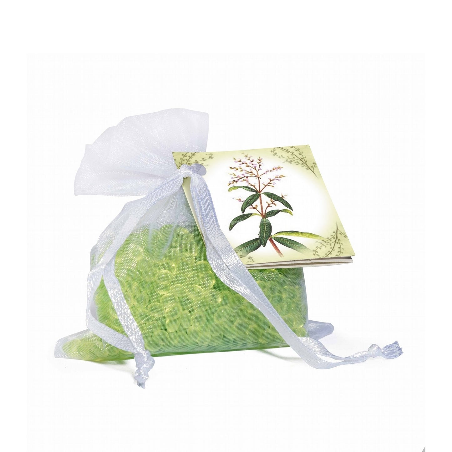 Perlas aromáticas perfumadas presentadas en un saquito de tul. La tecnología EVA permite que el aroma en forma de perlas se libere gradualmente durante mucho tiempo. Perfectas para perfumar la ropa en los cajones, maletas y automóviles. Aroma Cítrico que recuerda al frescor del verano con perfume a Hojas de Verbena del Mediterráneo y Frescos Limones. En un cajón su aroma puede durar hasta 6 meses.