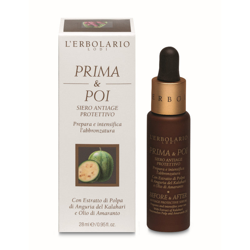 Éste sérum facial concentrado anti edad, prepara e intensifica el bronceado con extracto de pulpa de Sandía Kalahari y Aceite de Amaranto. Unas gotas antes de la exposición al sol permitirán que la piel se prepare, y una aplicación rápida después del sol ayudará a recuperar la frescura e hidratación. Su increíble conjunto de activos antioxidantes y protectores funcionan porque la producción de radicales libres responsables del envejecimiento prematuro de la piel se limita al máximo, mientras que el lipo-aminoácido intensificador del bronceado se activa para que el bronceado deseado se consiga rápidamente. 96% de ingredientes naturales, no contiene parabenos, siliconas, ni petrolatum. Dermatológicamente testeado. Vegano.