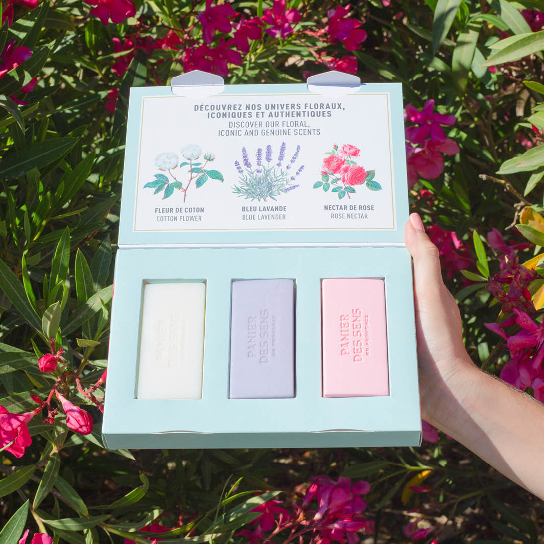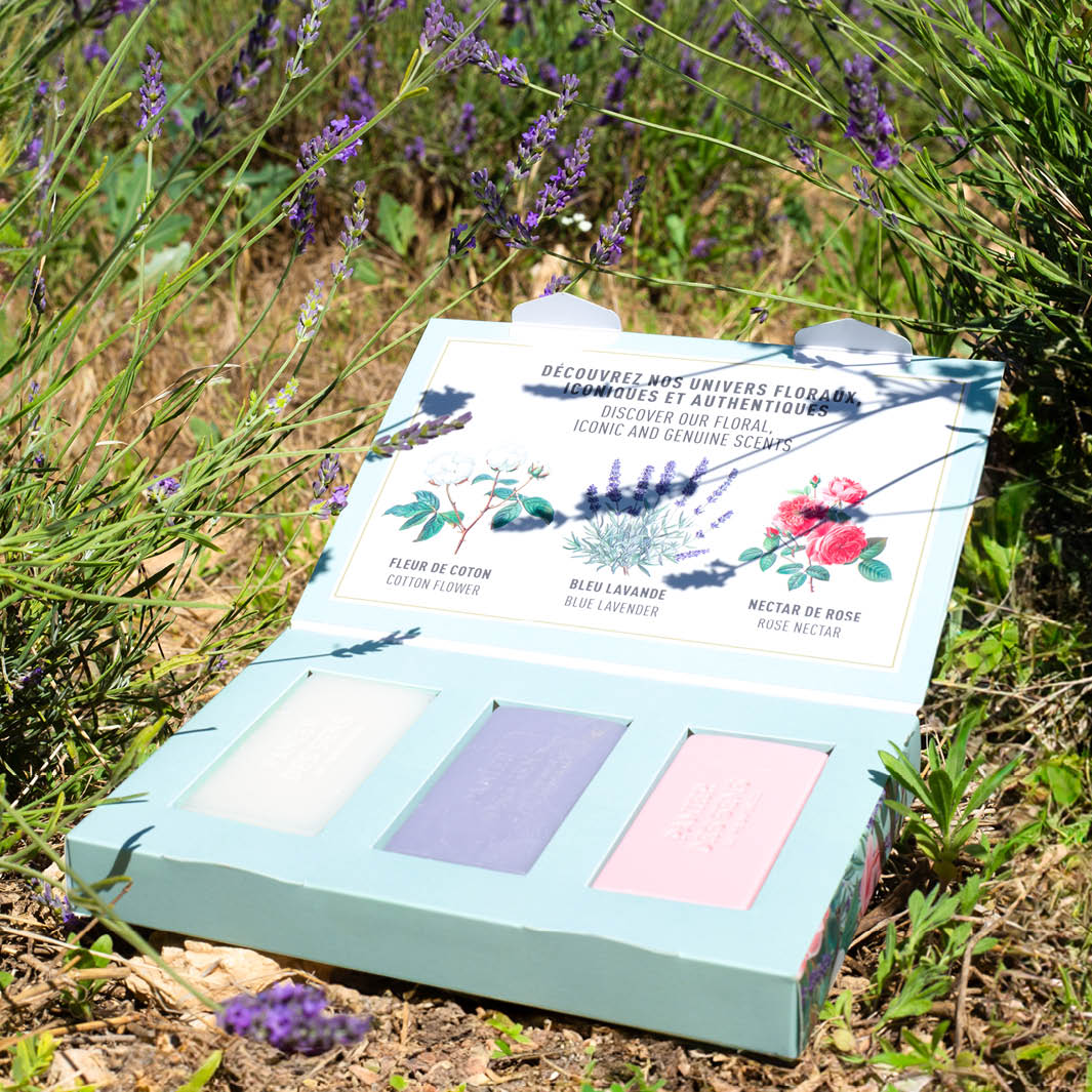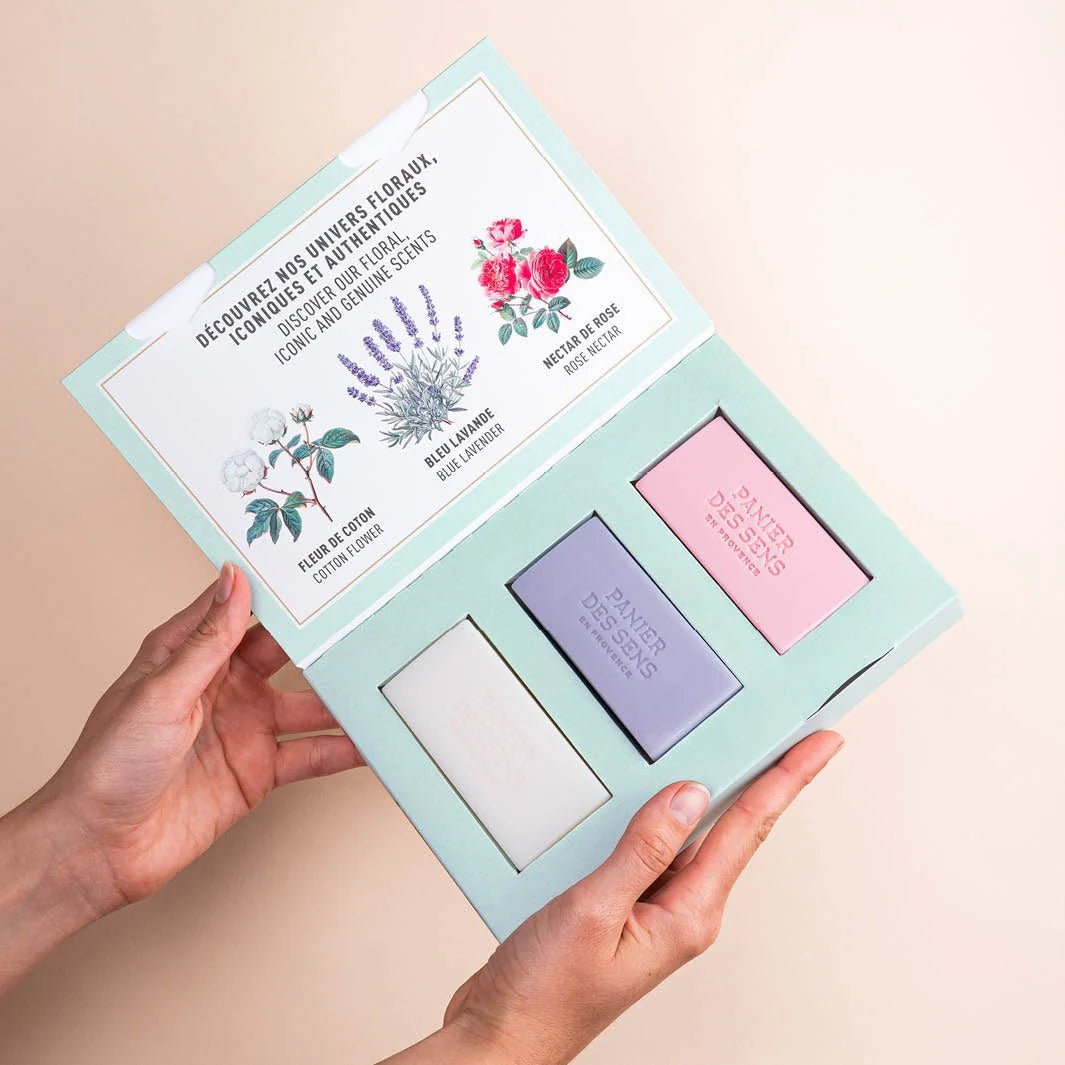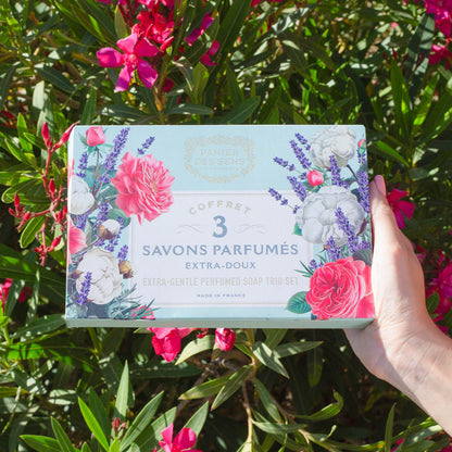 Precioso set de 3 jabones de regalo, extra suaves y enriquecidos con aceite de karité y un aroma que te transportan a la Provenza. El set incluye un jabón sólido perfumado extra suave - Lavanda Azul, un jabón sólido perfumado extra suave - Flor de Algodón y un jabón sólido perfumado extra suave - Néctar de Rosa.